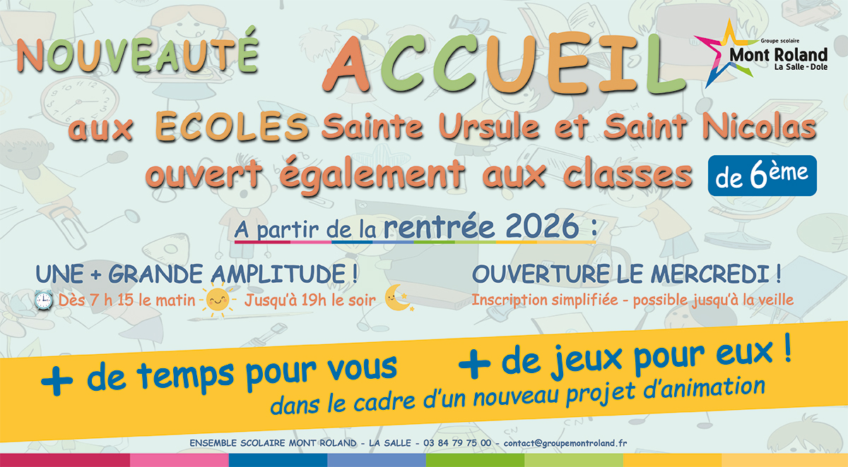 L’école Sainte Ursule est une école primaire de 500 élèves rattachée au groupe scolaire Mont Roland-La Salle. Située dans l’enceinte même du groupe scolaire proche du centre-ville de Dole, elle compte 6 classes maternelles et 12 classes élémentaires. Fondée sur le projet éducatif lasallien, notre mission d’éducation se fonde sur l’accompagnement de chaque enfant dans le respect de son parcours personnel et scolaire. Notre travail avec les familles et les enfants qui nous sont confiés s’articule autour du dialogue, de l’ouverture et de la confiance mutuelle. Ces points d’ancrage forment le socle d’un environnement serein, propice à développer chez chacun le goût d’apprendre et de grandir. Nous serons heureux de vous accueillir à Sainte Ursule !